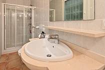 banheiro privativo com pia, chuveiro e vaso sanitário