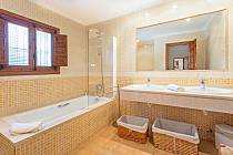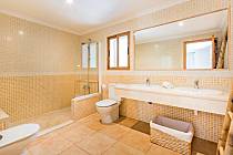 quarto de banho com lavatório duplo, combi banho com chuveiro, bidet e sanitário